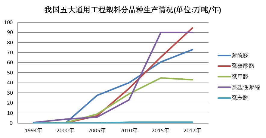 從工程塑料產品結構來看,目前聚碳酸酯的產能最大,占合計產能的32%;其次是聚酰胺工程塑料、熱塑性聚酯PBT分別占30~32%左右;聚甲醛占14%;聚苯醚的產能長期保持在萬噸水平,占比較小。下圖為1994年2017年國內五大通用工程塑料產能結構情況。與上世紀九十年代相比,聚碳酸酯生產增長較快,但生產仍以外資企業占主導,國內企業話語權仍較低。聚甲醛由于引進技術雷同,在2010年前后集中建成一批裝置,其產品檔次不高,均在中低市場參與競爭,因此新建裝置利用水平普遍不高,自給率50%左右,每年還需進口30萬噸左右。可喜的是,隨著我國自主技術發展和引進技術吸收再創新,在PBT領域,我國本土企業已占有一席之地,生產規模和產品質量均有較大程度提高,在滿足國內市場的同時已開始出口。我國是紡織品生產和出口大國,因此國內聚酰胺裝置以生產纖維級產品為主,同時由于受工藝技術限制,國內聚酰胺工程塑料品種產量占比不到其聚合產能的10%,國內汽車、電子領域需要的聚酰胺以進口和外資產品為主。