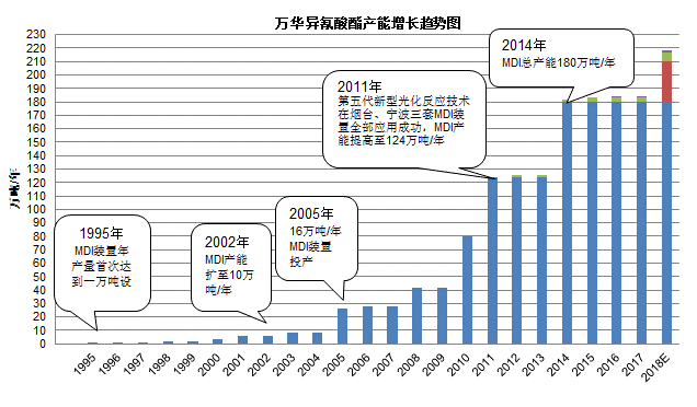 隨著MDI技術(shù)的創(chuàng)新突破,萬華化學(xué)迅速成長(zhǎng)為世界第一大MDI生產(chǎn)企業(yè)。2011年,第五代新型光化反應(yīng)技術(shù)成功在煙臺(tái)、寧波三套MDI裝置全部應(yīng)用成功,MDI總產(chǎn)能從80萬噸提高至124萬噸/年。2014年,萬華煙臺(tái)工業(yè)園老廠搬遷異氰酸酯一體化項(xiàng)目全線一次投產(chǎn)成功并生產(chǎn)出合格的MDI產(chǎn)品,MDI總產(chǎn)能達(dá)到180萬噸/年,穩(wěn)居世界首位。此外,萬華于2016年完成了對(duì)匈牙利最大化工公司寶思德100%股權(quán)的收購(gòu),成功實(shí)現(xiàn)了我國(guó)異氰酸酯行業(yè)“走出去”的第一步。
