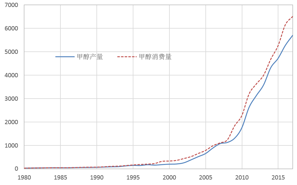 改革開放以來我國甲醇產能產量增長情況