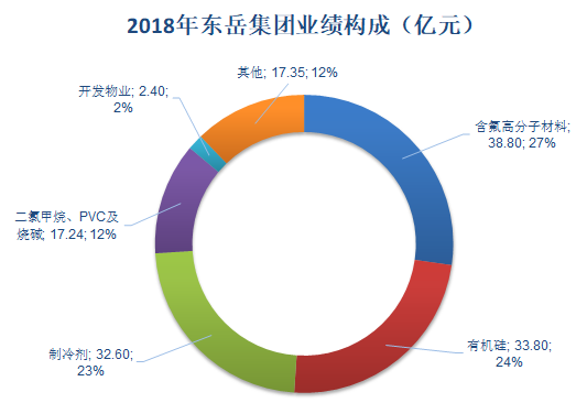 制冷劑、含氟高分子材料和有機(jī)硅業(yè)務(wù)是東岳集團(tuán)最主要的三大板塊,三大板塊營業(yè)收入占總營業(yè)收入四分之三。2018年東岳集團(tuán)靚麗的業(yè)績得益于主要板塊業(yè)績均實(shí)現(xiàn)了大幅度增長:2018年度東岳集團(tuán)制冷劑營業(yè)收入達(dá)32.6億元,盈利8.05億元;含氟高分子材料營業(yè)收入達(dá)38.8億元,盈利9.15億元;有機(jī)硅材料營業(yè)收入達(dá)33.8億元,盈利9.84億元。2018年東岳集團(tuán)業(yè)績構(gòu)成如下圖所示: