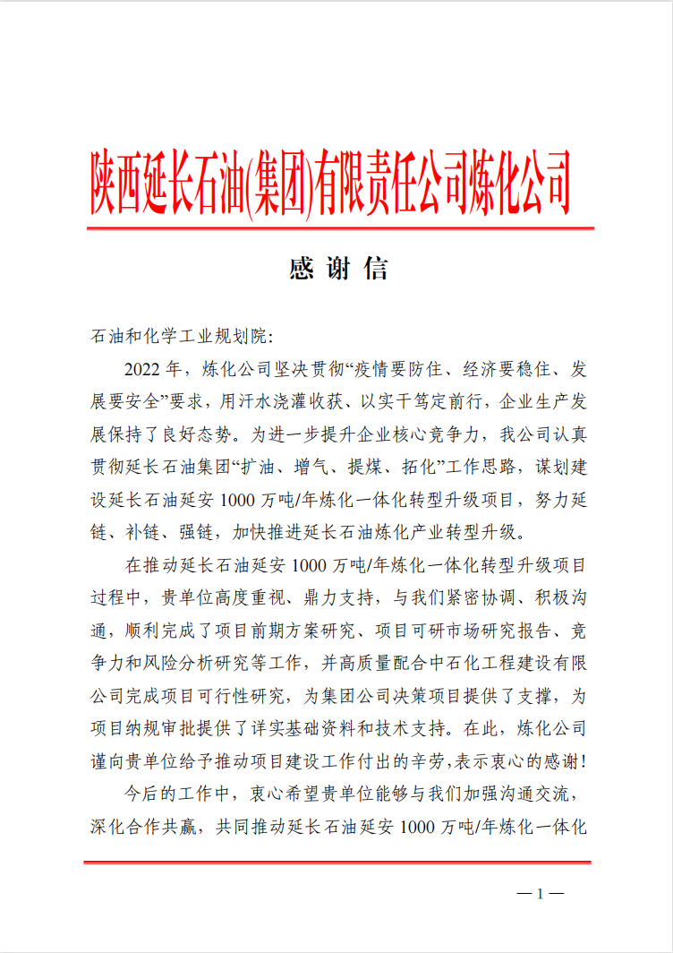 石油和化學工業(yè)規(guī)劃院與陜西延長石油(集團)有限責任公司煉化公司有著長期良好的合作關(guān)系,多年來為延長煉化公司的產(chǎn)業(yè)結(jié)構(gòu)轉(zhuǎn)型升級和“十四五”發(fā)展謀篇布局,結(jié)合國內(nèi)外煉化行業(yè)發(fā)展趨勢及國家政策要求,充分調(diào)研、認真研究,著力延鏈、補鏈、強鏈,深入分析1000萬噸/年煉化一體化轉(zhuǎn)型升級項目,為企業(yè)高質(zhì)量發(fā)展提供技術(shù)支持和建議。未來我院將不忘初心、牢記使命,發(fā)揮自身專業(yè)優(yōu)勢,一如既往持續(xù)做好相關(guān)技術(shù)支持工作,貫徹落實相關(guān)國家部委的政策措施,促進地方產(chǎn)業(yè)經(jīng)濟高質(zhì)量發(fā)展,協(xié)助重點企業(yè)與地方對接發(fā)展需求,做好政府決策的思想庫、行業(yè)發(fā)展的引領(lǐng)者、園區(qū)建設的顧問隊和企業(yè)發(fā)展的智囊團。