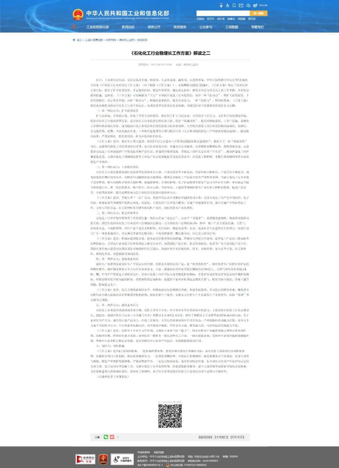《工作方案》提出,推進重大項目建設,推動5個以上在建重大石化項目2024年底前建成投產,推進開工一批“降油增化”項目,加強現(xiàn)代煤化工項目規(guī)劃布局引導;加大技術改造力度,實施重點行業(yè)能效、污染物排放限額標準,鼓勵升級改造,動態(tài)更新石化化工行業(yè)鼓勵推廣應用的技術和產品目錄;推進集約集聚發(fā)展,開展化工園區(qū)認定管理“回頭看”,指導推進化工園區(qū)規(guī)范化建設,支持石化化工領域國家新型工業(yè)化產業(yè)示范基地提升發(fā)展質量水平,打造化工新材料、非糧生物基材料等中小企業(yè)特色產業(yè)集群。