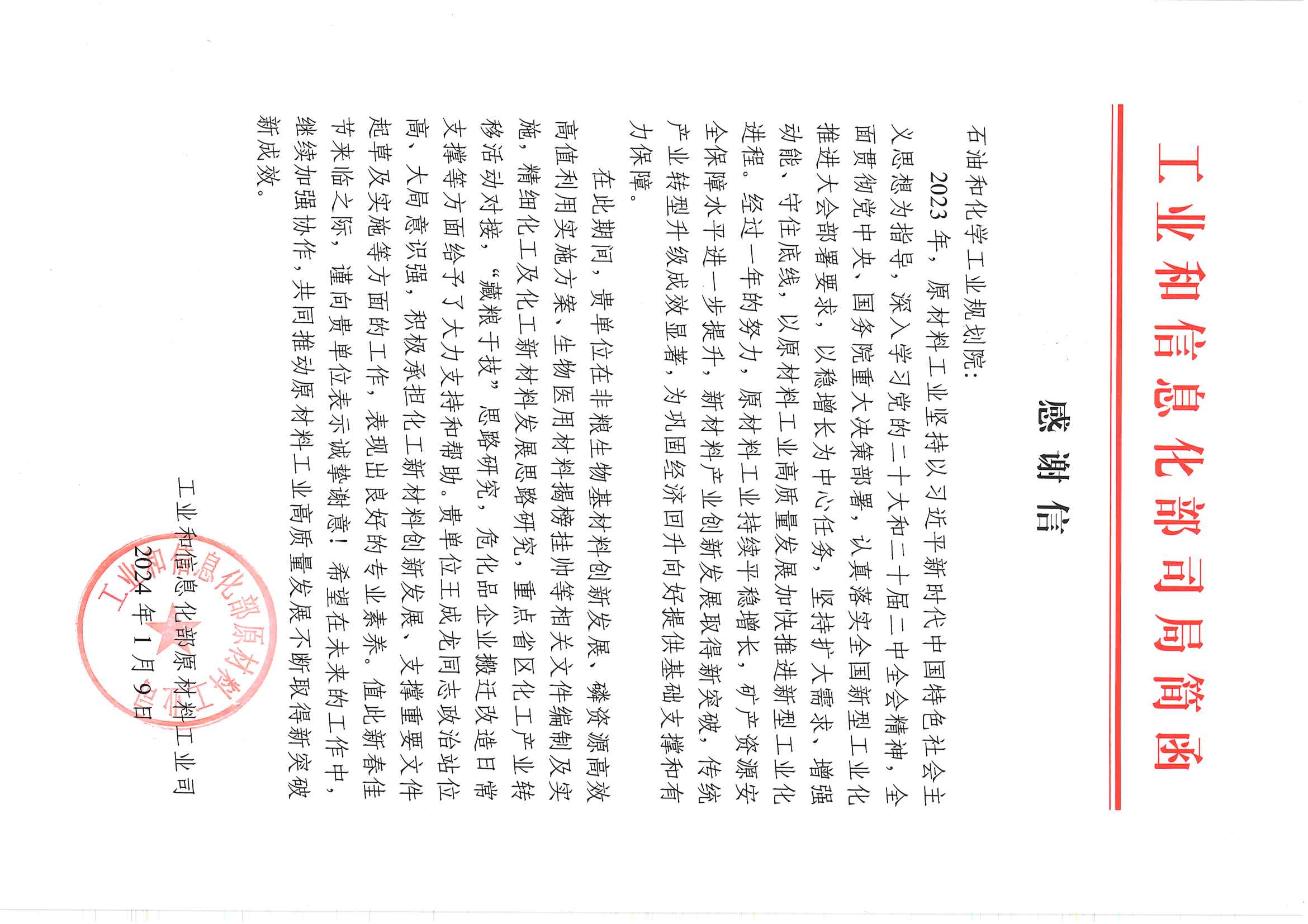 2023年是全面貫徹落實黨的二十大精神的開局之年,也是我國經濟發展的轉折之年。一年來,石油和化學工業規劃院積極發揮國家智庫的作用,支撐工業和信息化部原材料工業司在石化化工行業穩增長、精細化工及化工新材料創新發展、磷資源高效高值利用、非糧生物基材料創新發展、生物醫用材料揭榜掛帥、重點省區化工產業轉移對接、危化品企業搬遷改造等方面開展了一系列工作,獲得了工業和信息化部原材料工業司的高度認可。