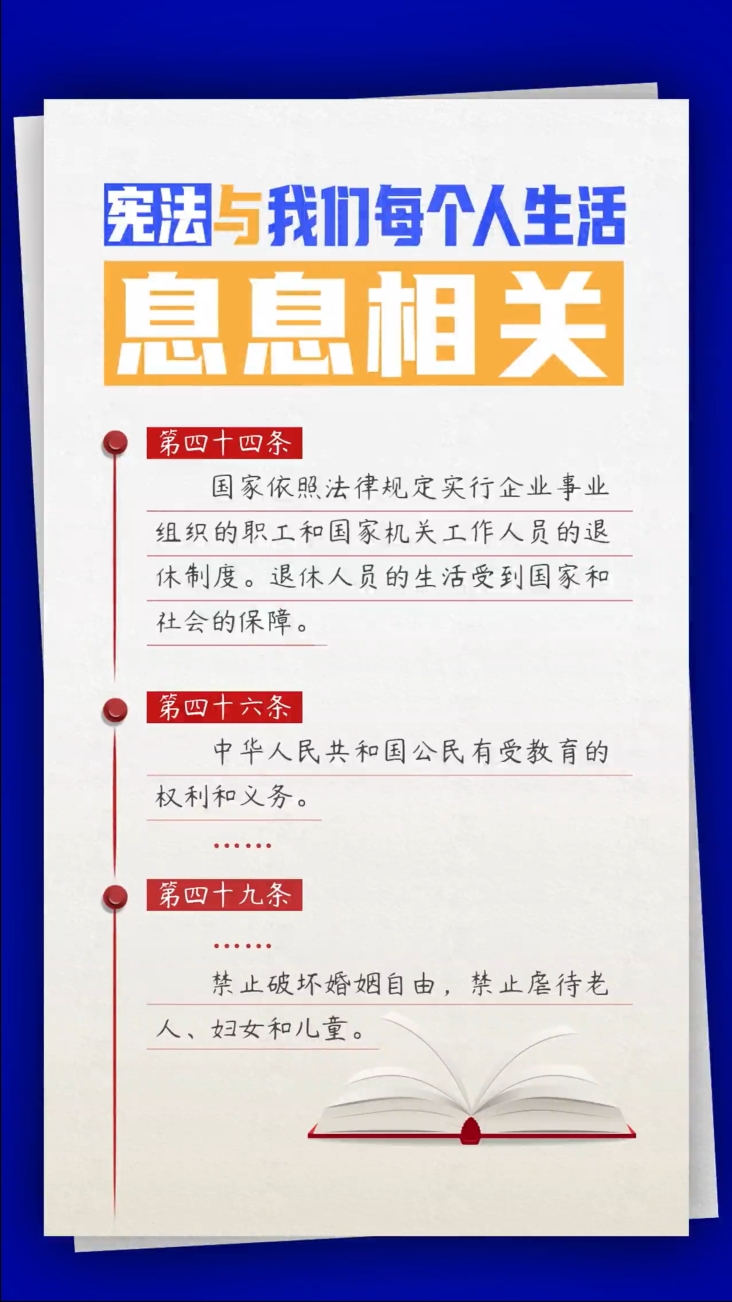 從出生,到老去,從入學(xué)、工作、結(jié)婚到退休,在人生的每一個(gè)重要時(shí)刻,憲法都默默地保護(hù)和陪伴我們。