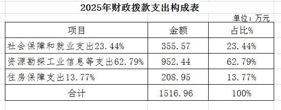 2025年財(cái)政撥款收支總預(yù)算1516.96萬(wàn)元。收入包括:一般公共預(yù)算撥款1486.13萬(wàn)元、上年結(jié)轉(zhuǎn)30.83萬(wàn)元;支出包括:社會(huì)保障和就業(yè)支出355.57萬(wàn)元、資源勘探工業(yè)信息等支出952.44萬(wàn)元、住房保障支出208.95萬(wàn)元。