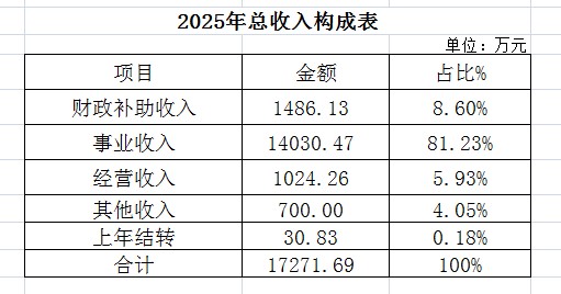 2025年收入預(yù)算17271.69萬(wàn)元,其中:一般公共預(yù)算上年結(jié)轉(zhuǎn)30.83萬(wàn)元,占0.18%;一般公共預(yù)算撥款收入1486.13萬(wàn)元,占8.60%;事業(yè)收入14030.47萬(wàn)元,占81.23%;事業(yè)單位經(jīng)營(yíng)收入1024.26萬(wàn)元,占5.93%;其他收入700.00萬(wàn)元,占4.05%。