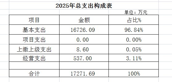 2025年支出預(yù)算17271.69萬(wàn)元,其中:基本支出16726.09萬(wàn)元,占96.84%;事業(yè)單位經(jīng)營(yíng)支出537.00萬(wàn)元,占3.11%;上繳上級(jí)支出8.60萬(wàn)元,占0.05%。