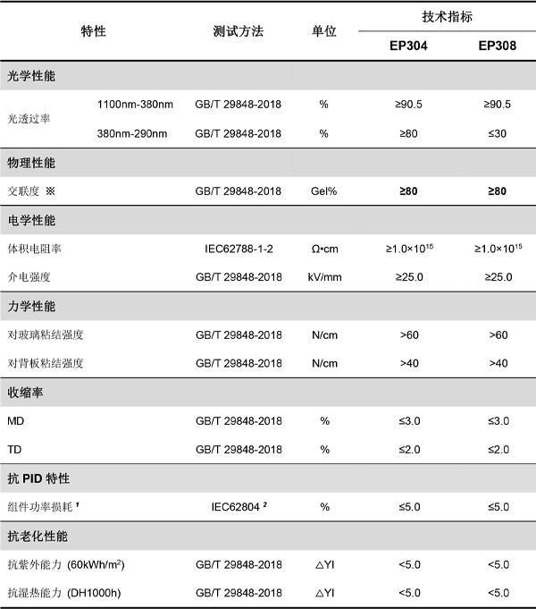 F·RST  EP304 & EP308產品是一款共擠型封裝膠膜產品,由EVA和POE采用物理共擠壓合而成,具有長效的雙面電池抗PID性能,可幫助P型或N型雙面電池常規和雙玻組件通過85oC,RH 85%,-1500Vdc,192h的PID測試。同時,EP系列膠膜兼具優異的粘結性能、透光性能和長期耐候性能。
